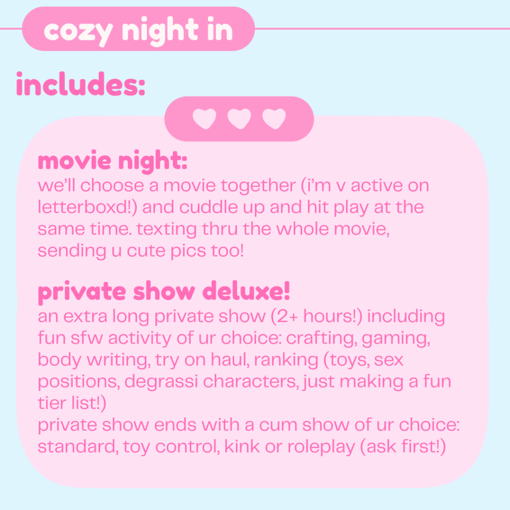 my standard private show includes a sweet strip tease, showing off with focal points of your choice, and a cum show!